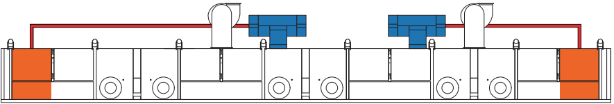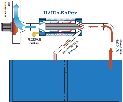 分別使用2個余熱回收將加熱后的新風送至第一節和后一節烘房 使首末烘房內的溫度更加穩定 減少從室外進入的新風量